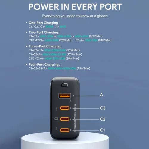 A 100W 4-Port PD wall charger with GaN power tech is powerful enough to charge laptops and other large-capacity devices. Supports both PD and Samsung super-fast charging, as well as, charging up to 4 devices via the built-in 3 USB-C and 1 USB-A ports. Easily store and travel while on the go, with its foldable plug design.