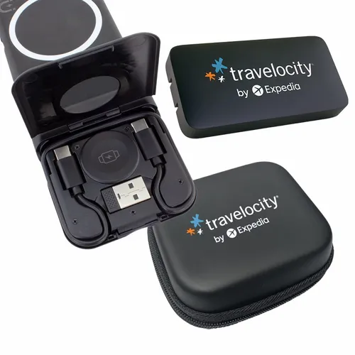 This is the perfect travel kit for busy teams that travel a lot for business and need to keep multiple devices charged and ready to go. It comes with our new Chi-Charge Snap(#2285) that wirelessly charges a phone, Apple Watch, and AirPods. It features a compartment that conveniently stores a USBC-to-USBC cable and a Type-C-to-USB adapter. Additionally, the kit comes with our new slim and convenient USB-C and USB-A AC adapter(#2181). It all comes neatly packaged in a stylish portable zipper case.