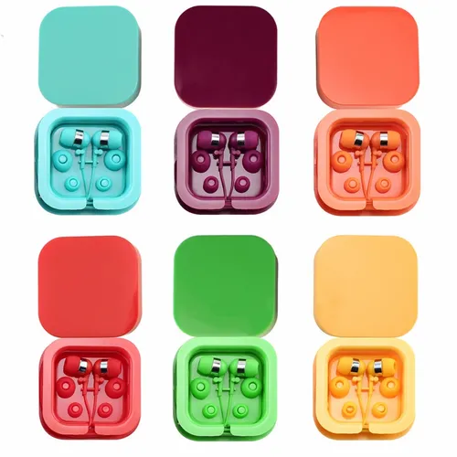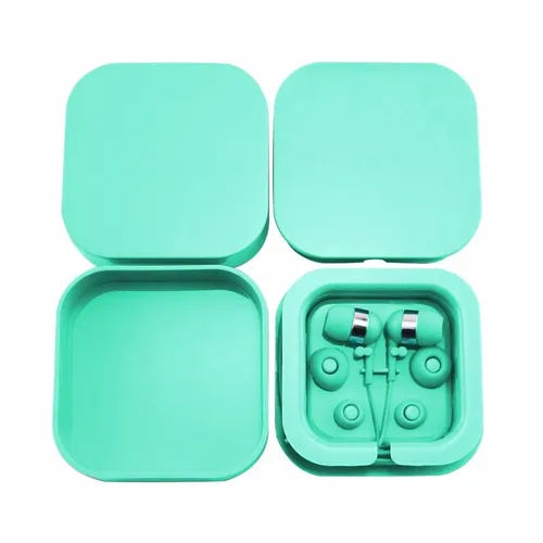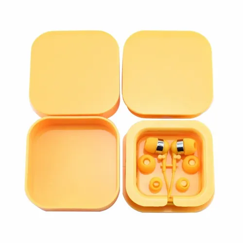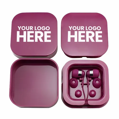 Plastic colorful ear buds in a square case with interchangeable ear bud covers. Print your logo on the case for a fun giveaway item!