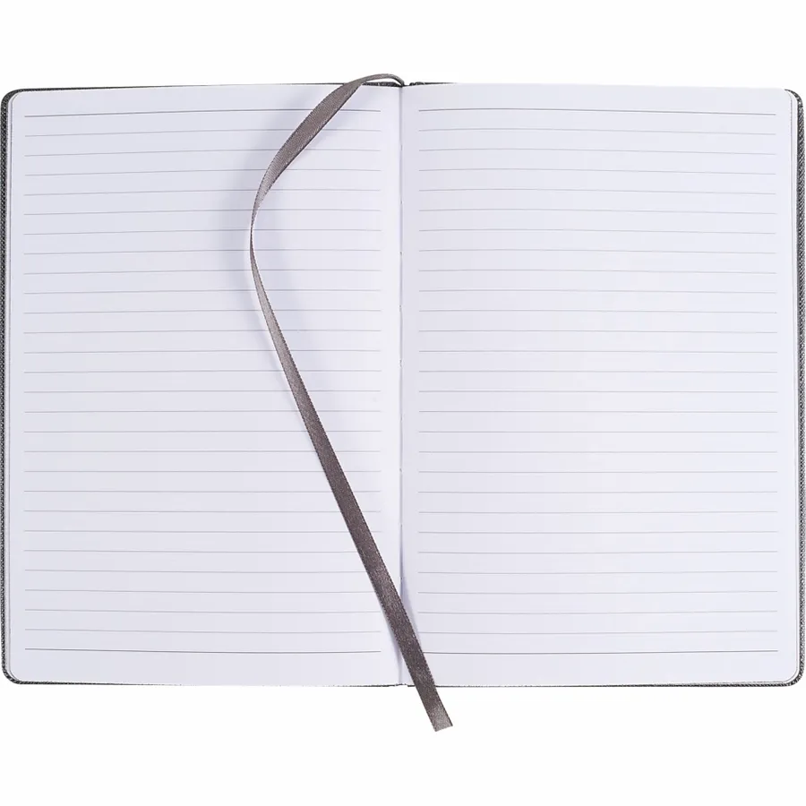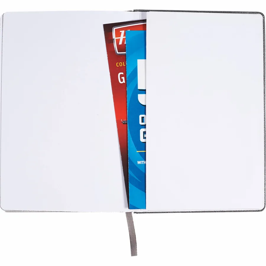 The 5.5 x 8.5 FSC Mix Modena Bound Journal features a premium, textured hard cover. This custom notebook includes an elastic pen loop on the spine and elastic closure. The Modena Bound Journal features a ribbon page marker, back document accordion pocket, and 96 white lined sheets of FSC Mix paper with color-matching painted edges.