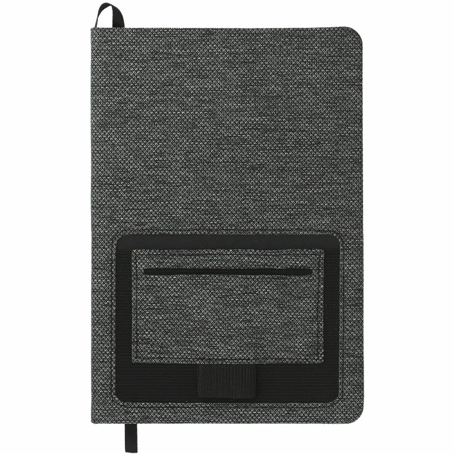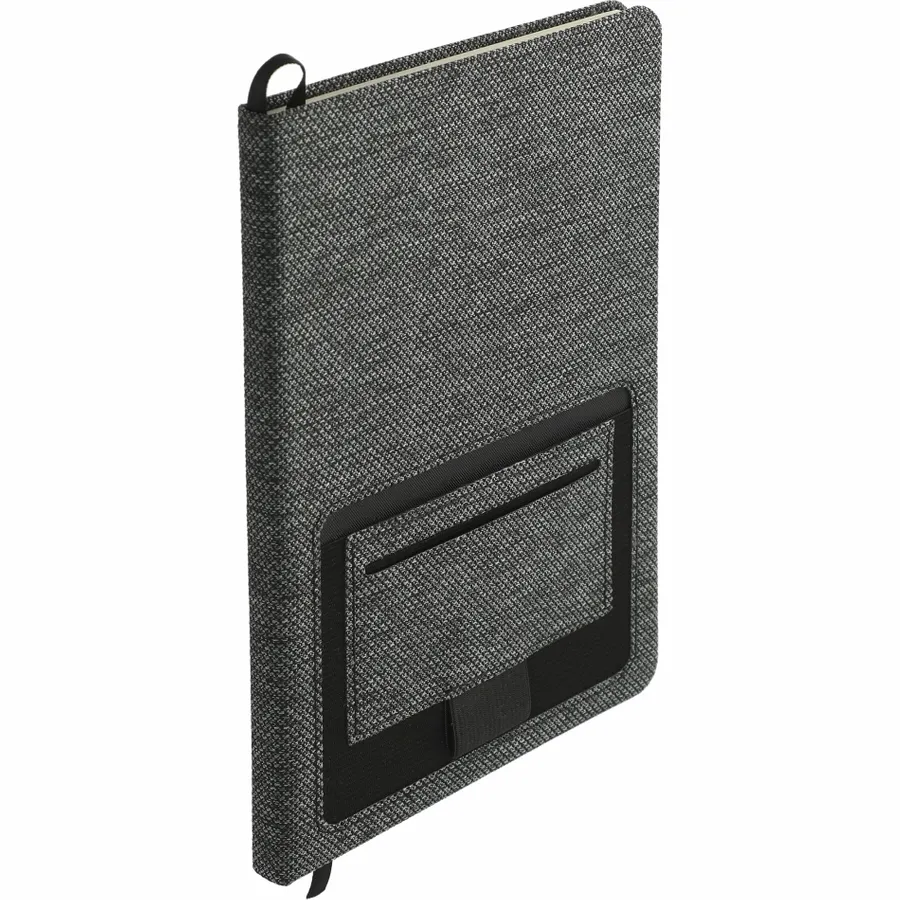 The 5.5” x 8.5” FSC Mix Vila RPET Bound Notebook features a hard, 100% Recycled PET cover with built in front pocket organization to hold a smartphone or business cards. Includes 80 sheets of cream lined FSC Mix paper, black ribbon page marker and black elastic pen loop. By choosing this notebook, youre making a positive impact on the environment, as one percent of sales are donated to environmental nonprofits through a partnership with 1% For The Planet.