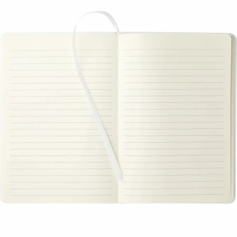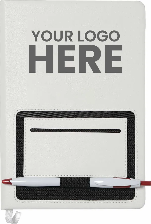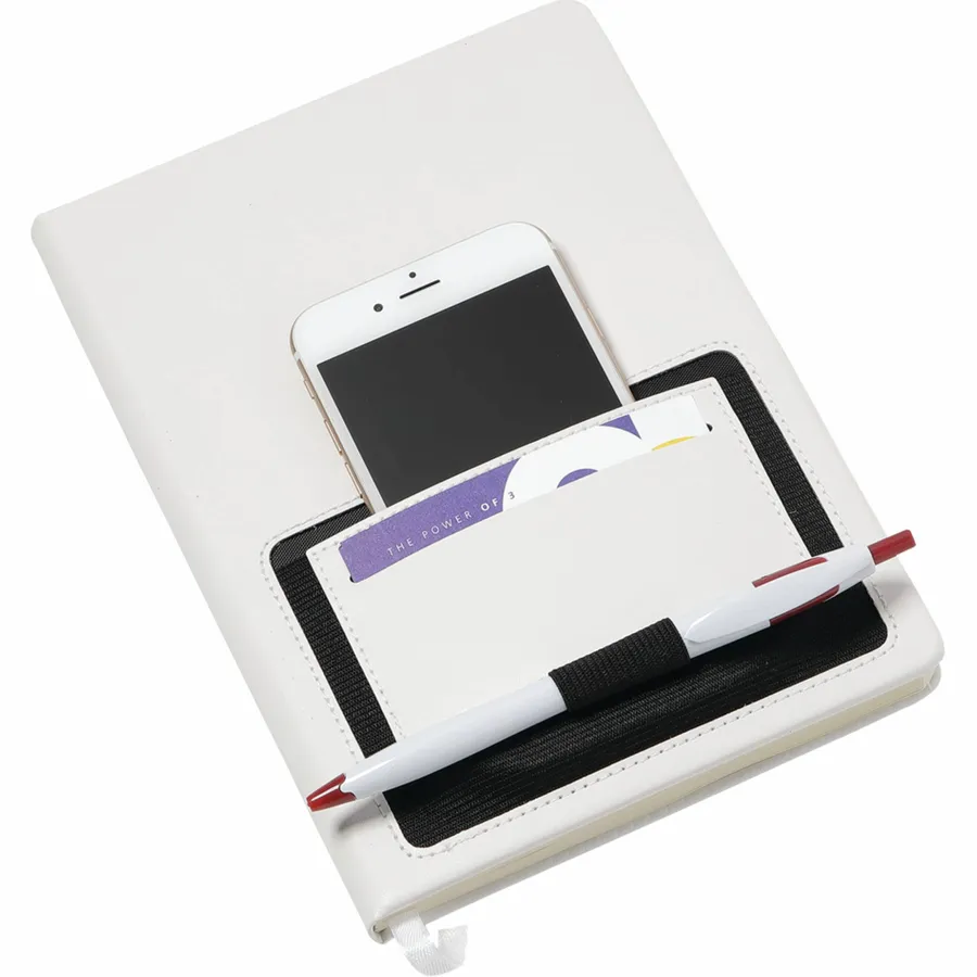 The 6 x 8 FSC Mix Moda Notebook is an eye-catching, PU, hardbound journal with 80 sheets of cream lined FSC Mix paper inside. It includes a color matching ribbon page marker and a front pocket that can hold a smartphone and has a business card slot. The Moda Notebook also has an elastic pen loop.