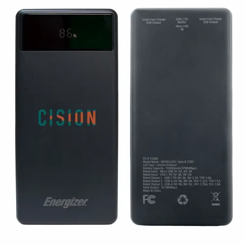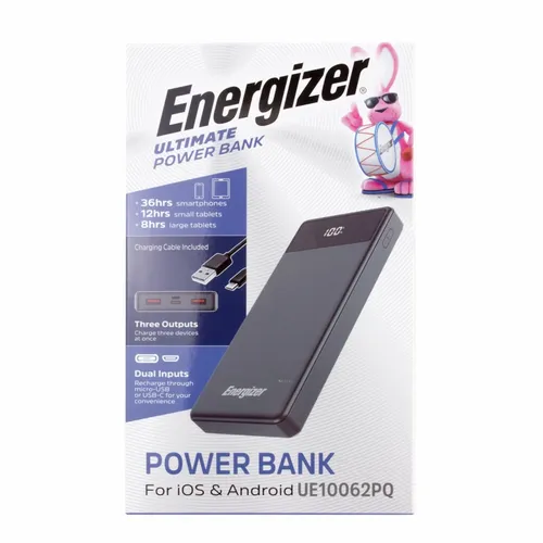 A great looking Energizer power bank with 10,000 mAh battery capacity. It's a great device for daily use for any busy professional. Specifications: Cell Type: Lithium Polymer/ Battery Capacity: 10000 mAh/37Wh(Max.)/ Rated Input: Micro USB 5V =-2A, 9V=2A/ Rated Input: USB-C PD 5V=3A, 9V=2A/ Rated Output 1: USB-C PD 5V=3A, 9V=2.2A, 12V=1.5A/ Rated Output 2: USB-A 5V=3A, 9V=2A, 10V=2.25A, 12V=1.5A/ Rated Output 3: USB-A 5V=3A, 9V=2A, 10V=2.25A, 12V=1.5A/