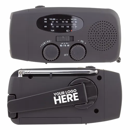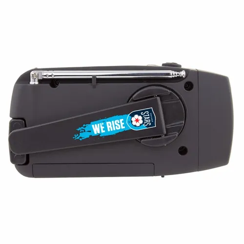 A compact and portable solar AM/FM radio for outdoor activities that allows you to stay informed or enjoy listening to music. A perfect promo item for active teams that enjoy tech, sports, travel, camping, or cozy picnics.